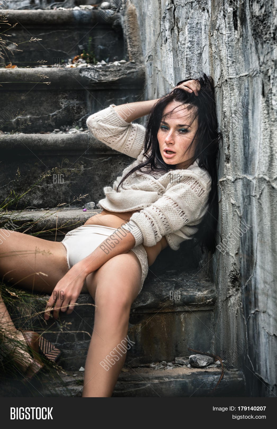 Spread her legs on the stairs