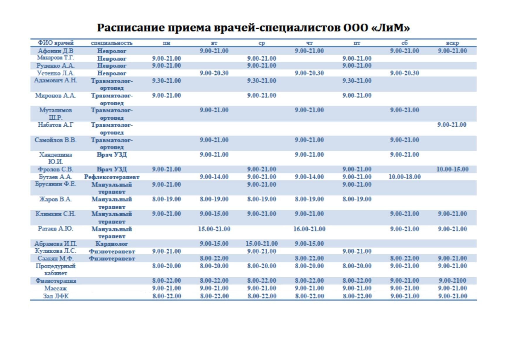 Schedule of doctors of the children's clinic 4