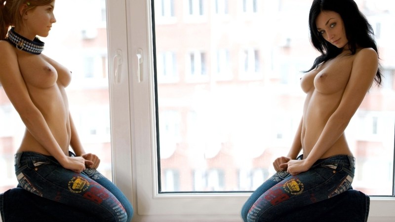 Beautiful girls topless in jeans